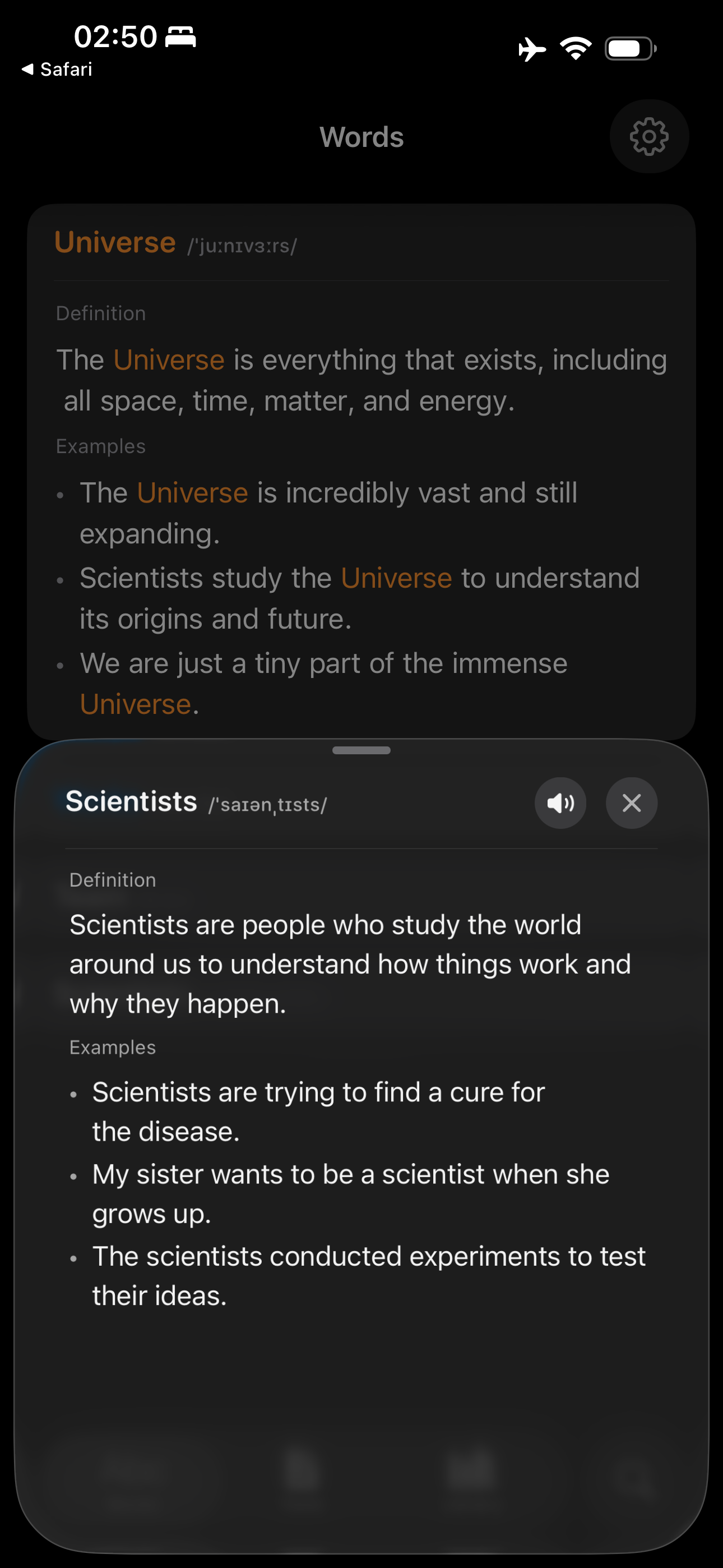 Long press any word to instantly reveal its definition within the app. No interruptions, just pure learning.